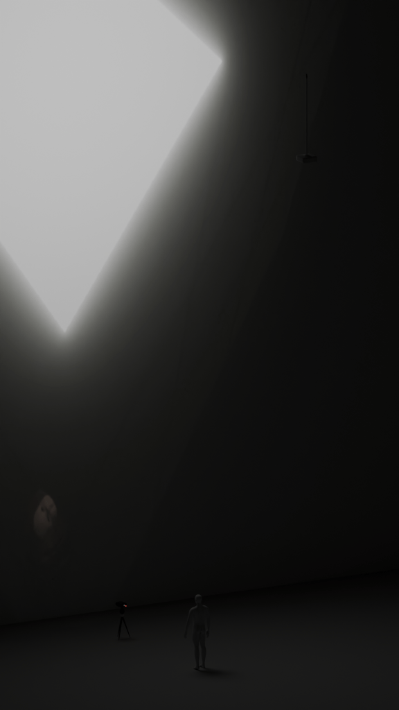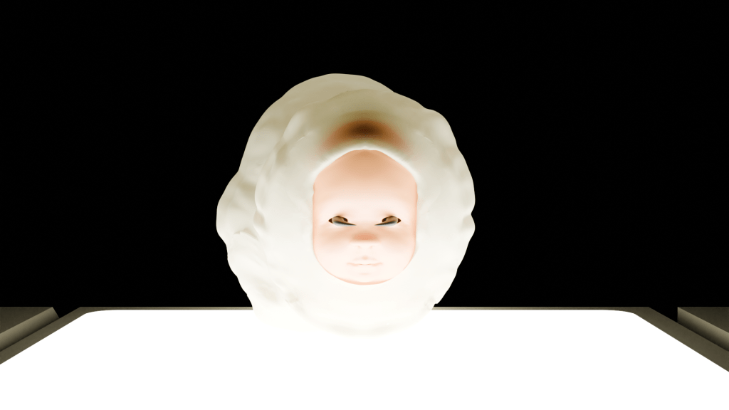 Φ is a real-time simulation, In this artwork’s virtual world, a worm is constantly following the cube’s light, as it is terrified of the darkness. The cube continuously learns through an algorithm and, in turn, reshapes the image it renders. The insect’s figure fuses a child’s body with a soft-bodied bug—an embodiment of life pared down to its most fragile form. In the world of social media, this kind of reduction—boiling people down to tractable signals—creates ideal conditions for controlling behavior.