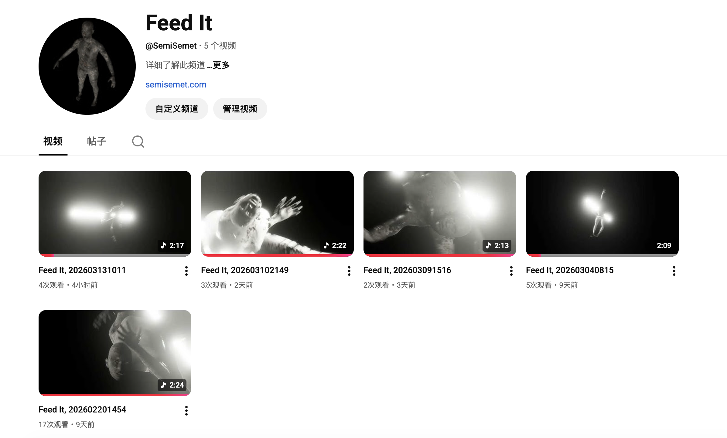 Feedit 是我与音乐制作人 RedValentine 合作的一个项目。我使用 Unity 引擎制作了一个程序:在一个虚拟世界中,一个人物模型漂浮在虚空里。随着音乐节奏,发光的柱体不断生成,并插入到人体之中。人物的面部表情表现出愉悦,但身体姿态却呈现出痛苦的状态。